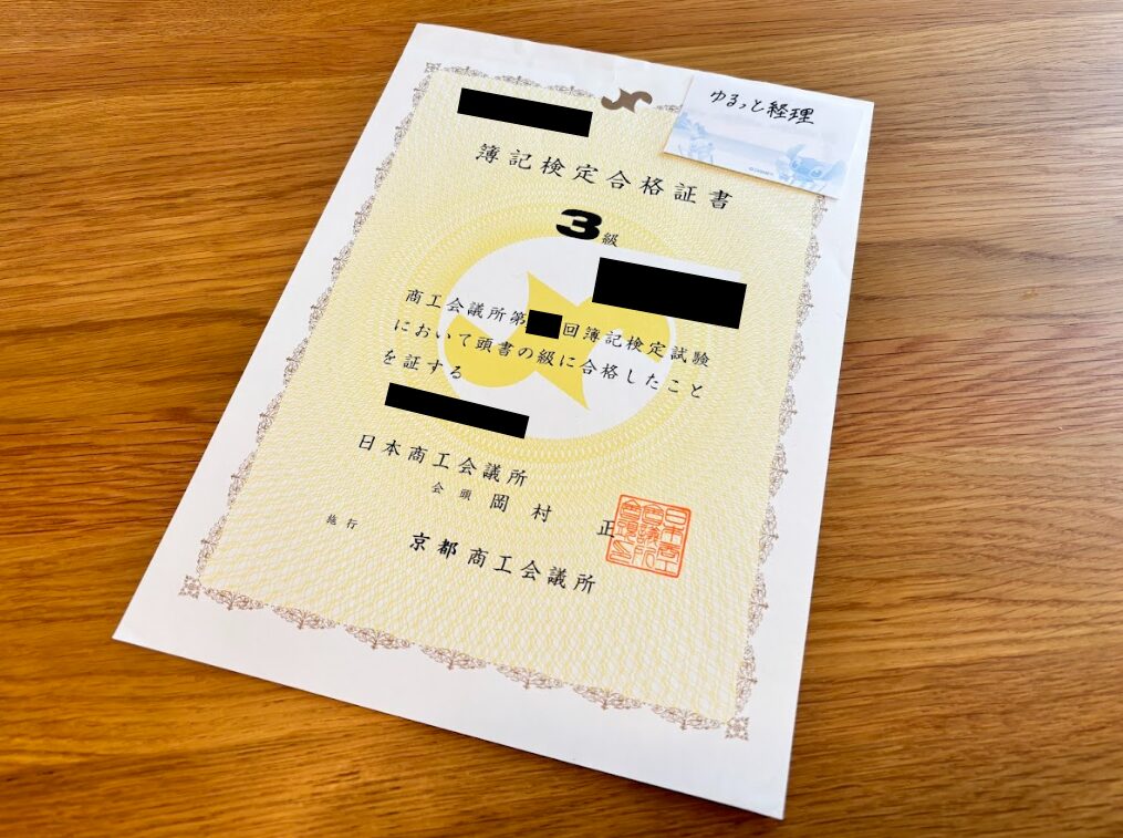 簿記3級の合格証明書
